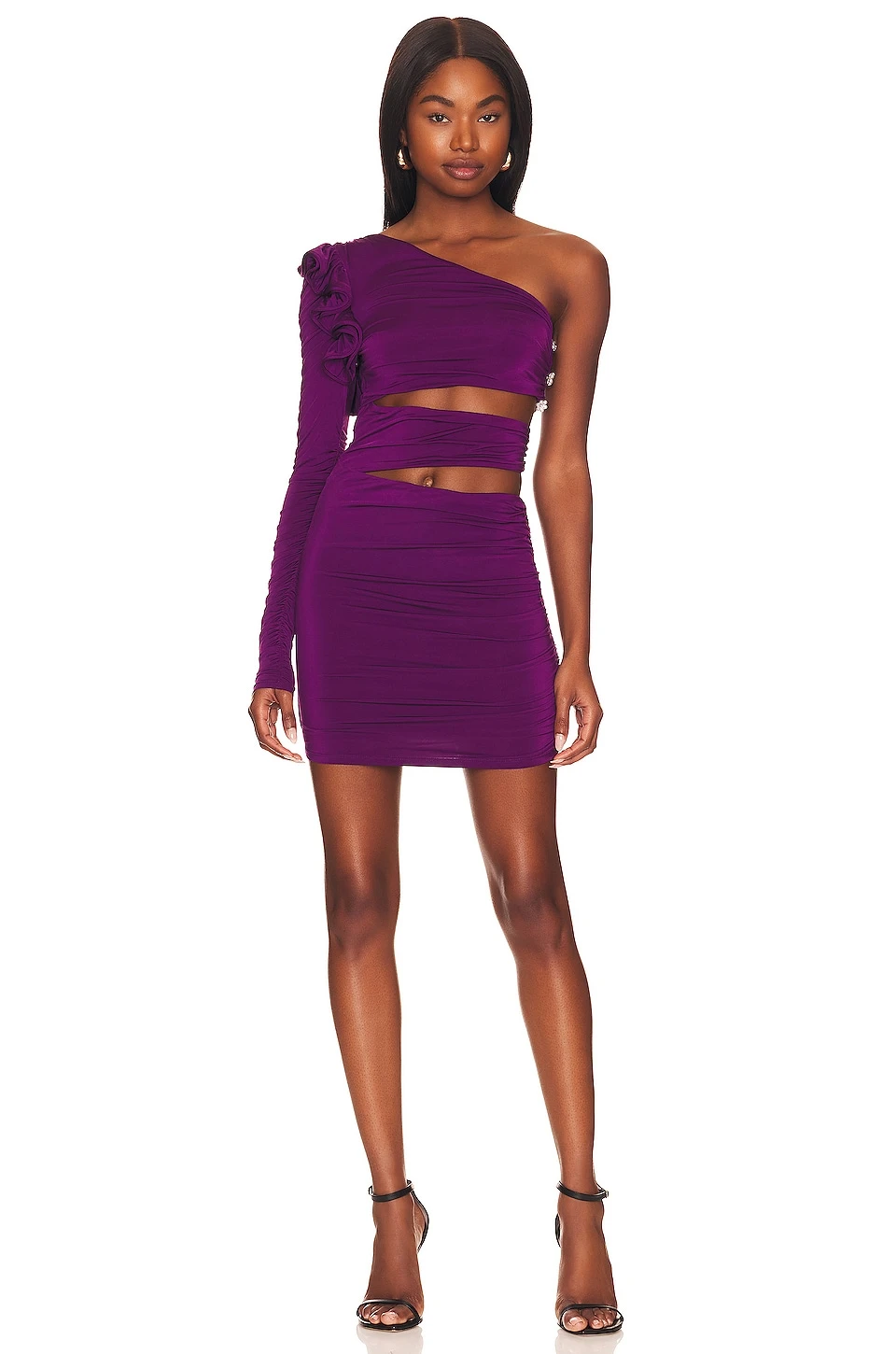 - One shoulder styling with ruffle trim