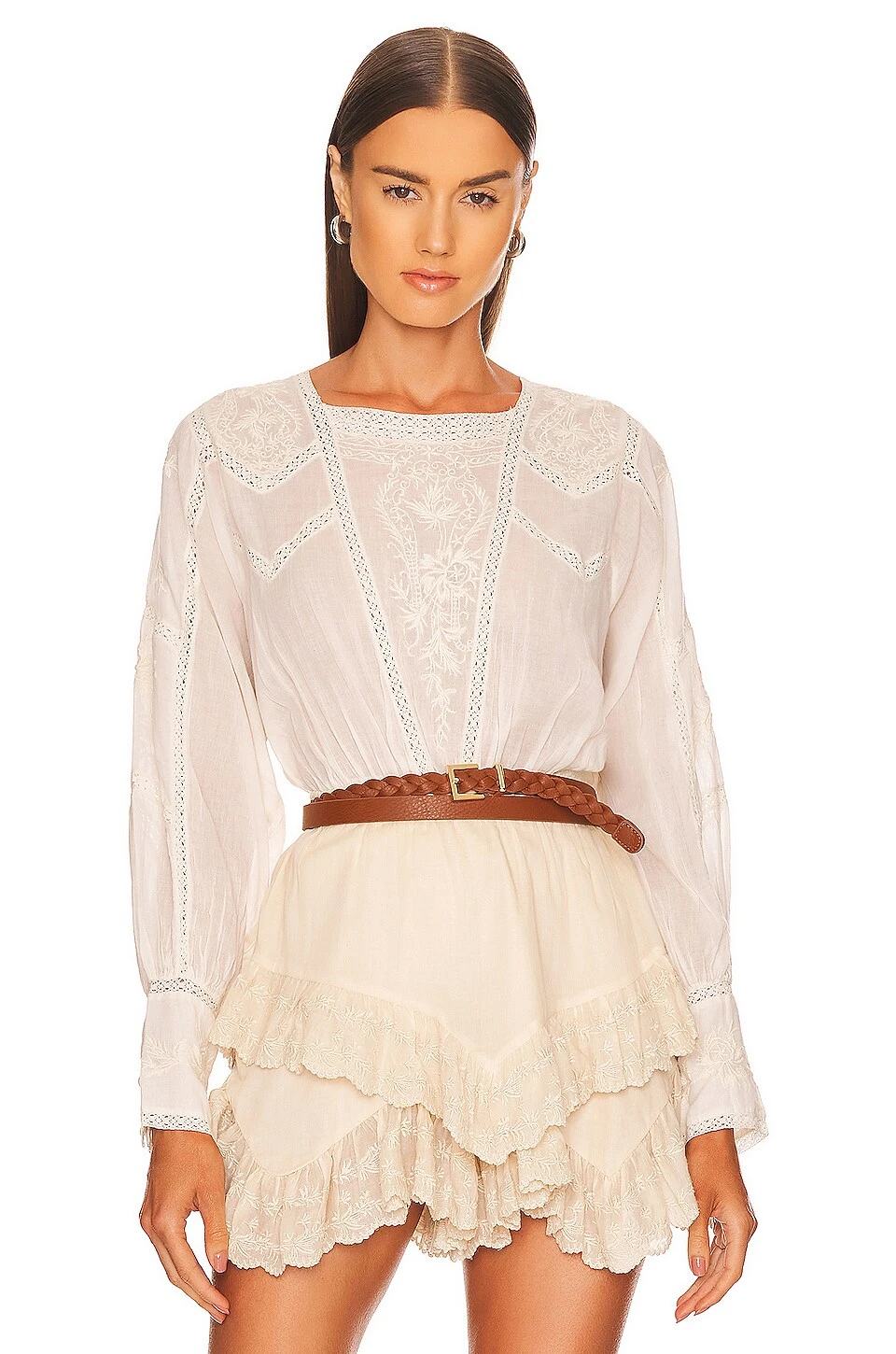 - Floral embroidery with lace trim