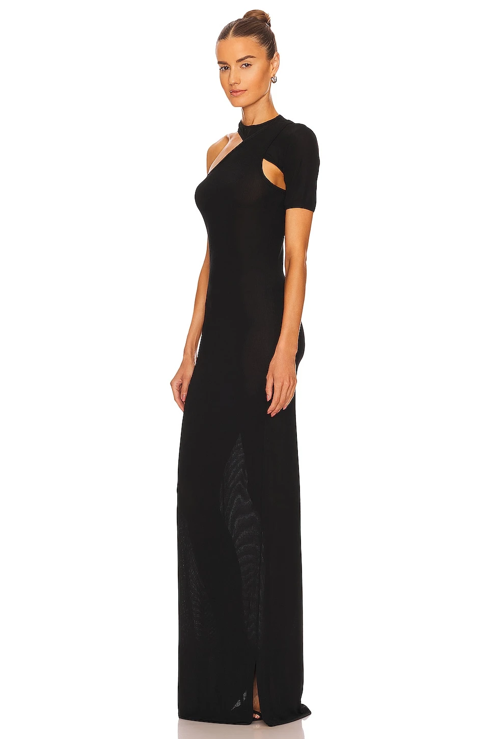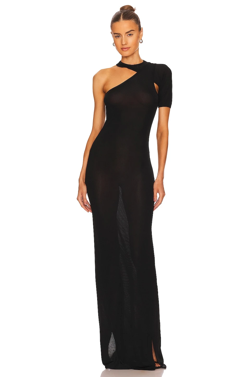 93% acetate, 7% elastane. Made in Italy. Hand wash. Unlined. Pull-on styling. Asymmetric neckline cut-out with one shoulder styling. Semi-sheer lightweight ribbed fabric with slit detail at hem. Revolve Style No. RTAR-WD77. Manufacturer Style No. WU22K160-D1011BLACK.