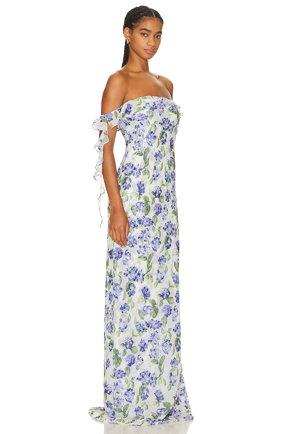 - Off shoulder styling with cascading draped fabric
